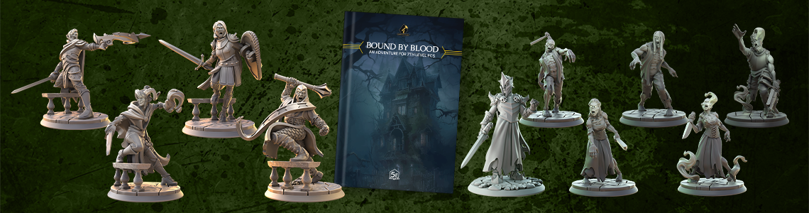We’re thrilled to share some exciting news with you all. After months of hard work and creative collaboration, we’re finally ready to unveil our first-ever 5e-compatible adventure: Bound by Blood, accompanied by brand new miniatures of your heroes, a dastardly villain, and a horde of undead!